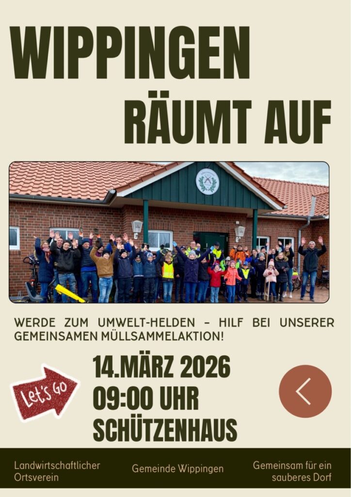 Der Landwirtschaftliche Ortsverein und die Gemeinde Wippingen laden herzlich zum Frühjahrsputz ein. Gemeinsam wollen wir Straßen, Wege und Wiesen vom Winter-Unrat befreien.