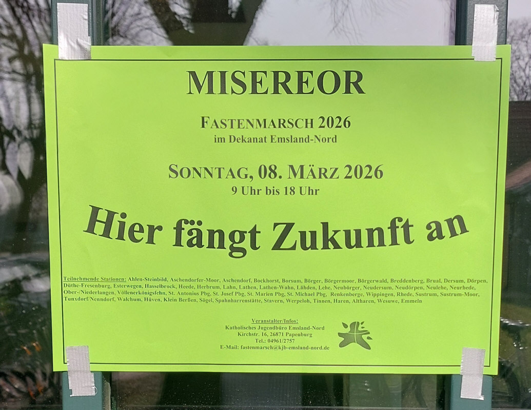 Am 08.03.2026 findet der Misereor-Fastenmarsch unter dem Motto „Hier fängt Zukunft an“ statt. Die Hefte können ab sofort für 0,50 € im Dorfladen erworben werden. Dort liegt auch wieder die Liste für Essenspenden aus, in die sich gerne eingetragen werden kann.
