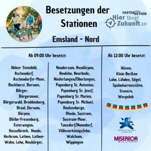 Am 08.03.2026 findet der Misereor-Fastenmarsch unter dem Motto „Hier fängt Zukunft an“ statt. Die Hefte können ab sofort für 0,50 € im Dorfladen erworben werden. Dort liegt auch wieder die Liste für Essenspenden aus, in die sich gerne eingetragen werden kann.