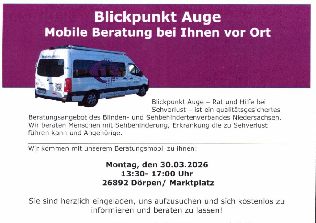 Das Beratungsmobil kommt am Montag, den 30.03.2026 von 13.30 - 17.00 Uhr nach Dörpen auf den Marktplatz. Interessierte sind herzlich eingeladen, um sich kostenlos informieren und beraten zu lassen.