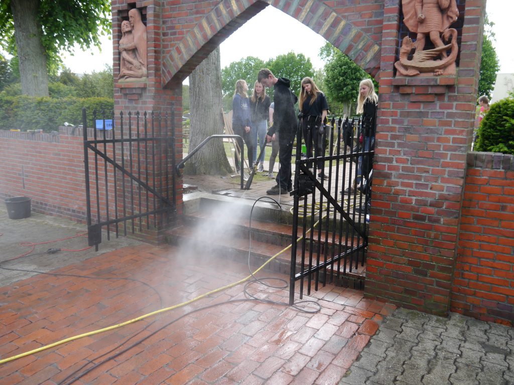 Einigen war aufgefallen, dass die Friedhofsmauer mit dem grünen Belag eine Reinigung vertragen könnte und spontan wurde der Hochdruckreiniger eingesetzt. Das Eingangstor wurde einer etwas schonenderen Reinigungsmethode unterworfen.