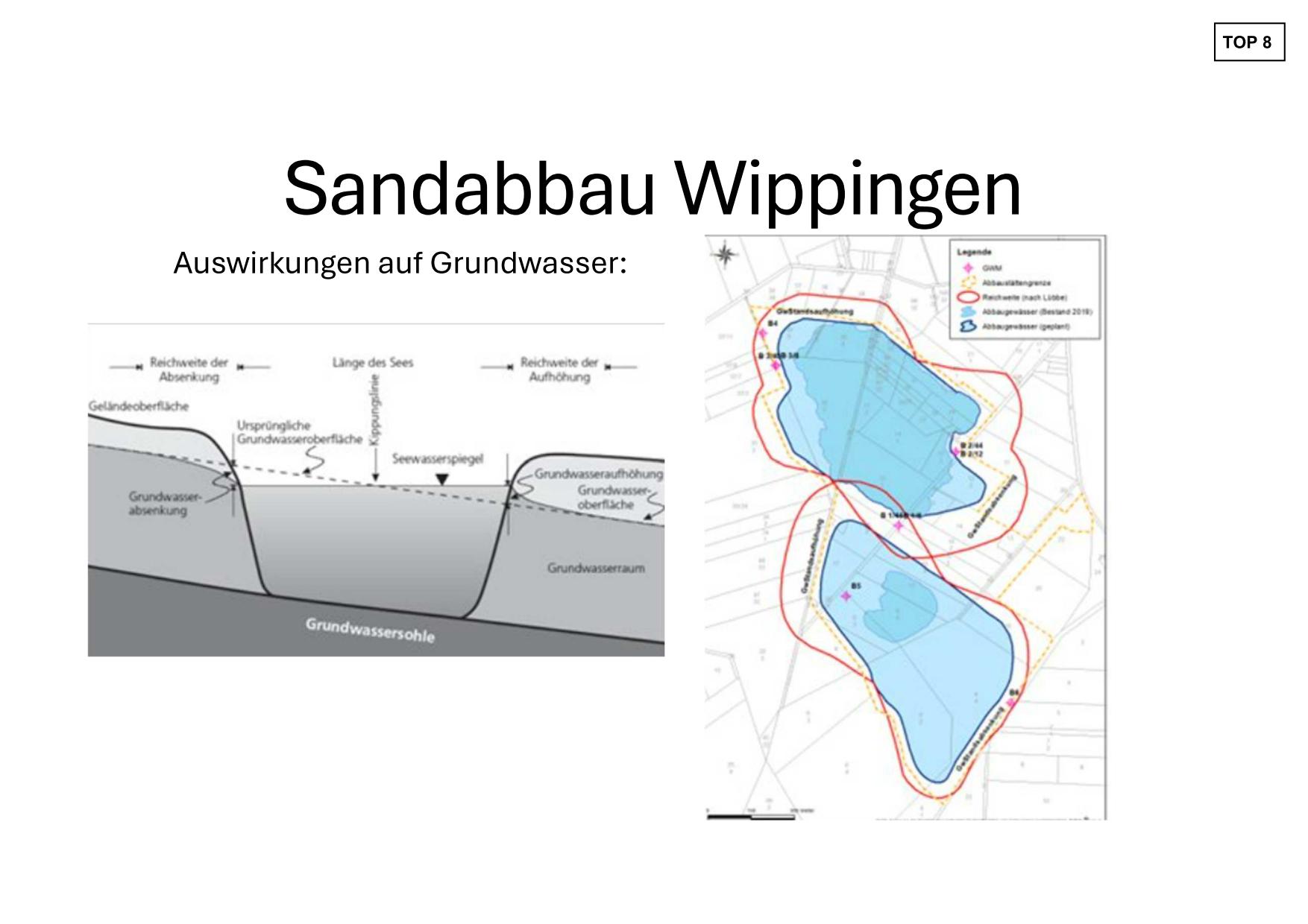 Die Folie auf Seite 13 der Präsentation stellt die Veränderungen des Grundwassers durch die Ausbaggerung des Südsees dar. Es komme auf der Südseite (Richtung Gutshofstraße) zu einer lokal sehr begrenzten Grundwasserabsenkung und auf der Nordseite des Sees zu einer Grundwasseraufhöhung. Diese mache sich auf den angrenzenden landwirtschaftlichen Flächen durchaus bemerkbar. Aber - so Hempen - ihm sei von Landwirten versichert worden, dass dies sich dort eher positiv auswirken würde.