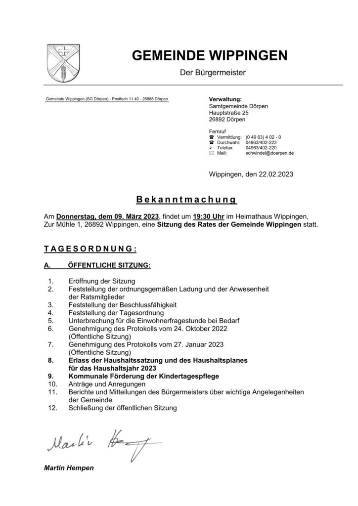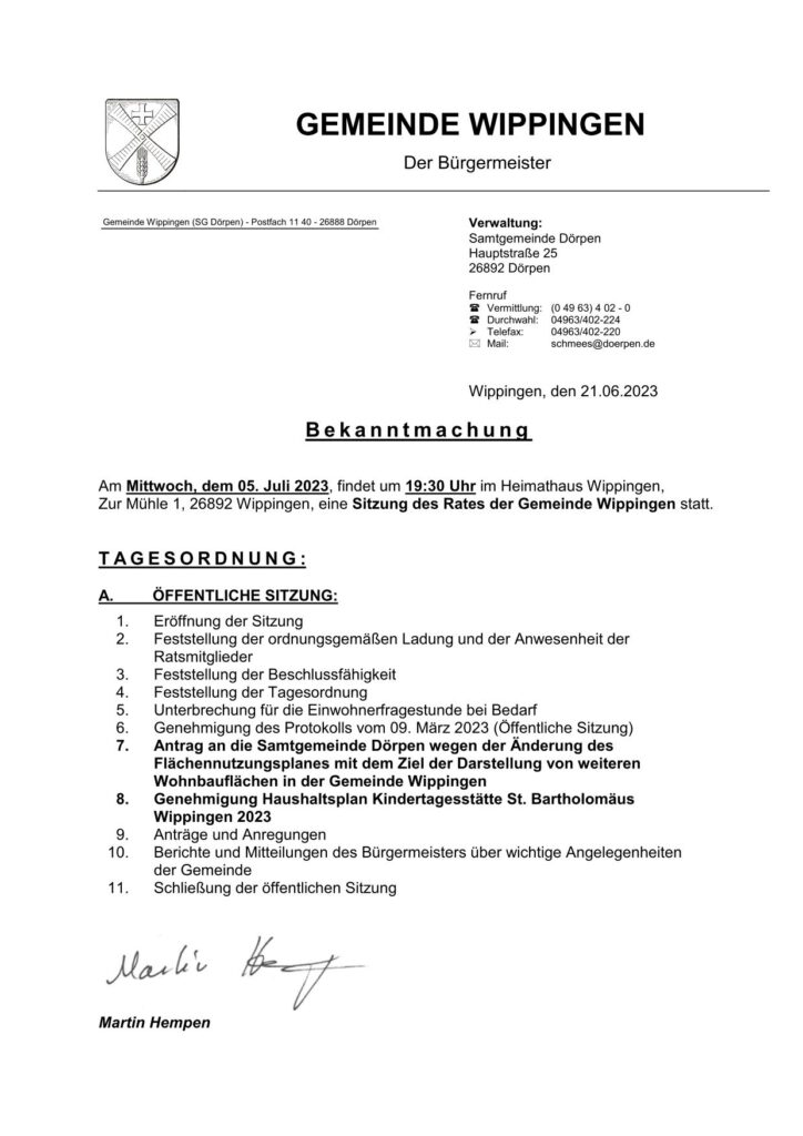 Am Mittwoch, dem 05. Juli 2023, findet um 19:30 Uhr im Heimathaus Wippingen, Zur Mühle 1, 26892 Wippingen, eine öffentliche Sitzung des Rates der Gemeinde Wippingen statt.