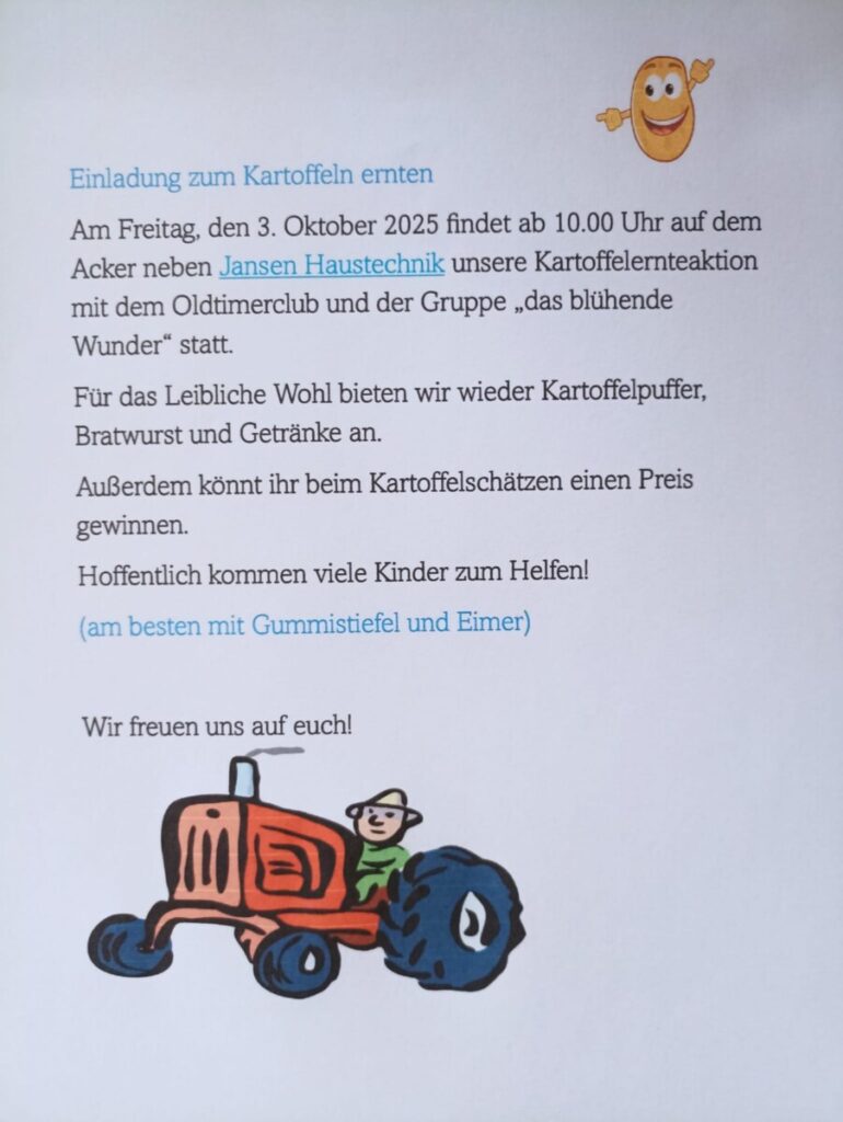Am Freitag, den 3. Oktober 2025 findet an 10 Uhr auf dem Acker neben Jansen Haustechnik unsere Kartoffelernteaktion mit dem Oldtimerclub und der gruppe "das blühende Wunder" statt.