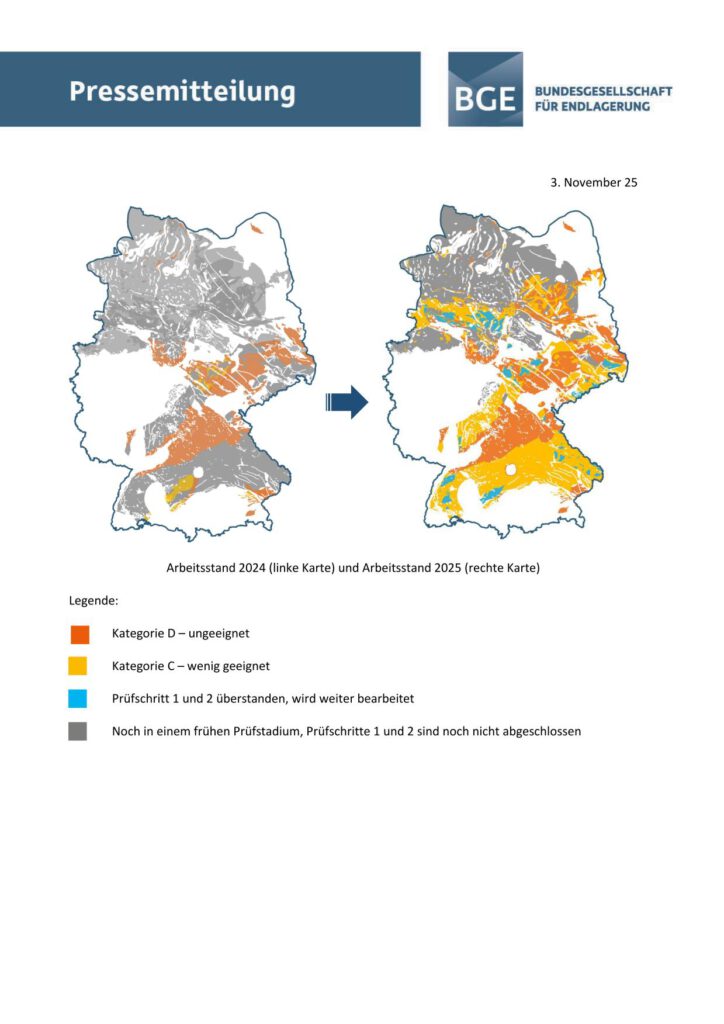 Mit den im Jahre 2020 veröffentlichten Teilgebietsflächen wurde etwas mehr als die Hälfte der Bundesrepublik als grundsätzlich weiter zu bewerten eingestuft. Mit dem Arbeitsstand 2025 hat die BGE insgesamt 53 Prozent der Teilgebietsflächen anhand sicherheitsgerichteter Kriterien als ungeeignet oder gering geeignet eingestuft. Das bedeutet, dass etwa ein Viertel der Bundesfläche noch in Bearbeitung ist. Das sind noch 47 Prozent der Teilgebietsflächen, die sich teilweise überlagern.