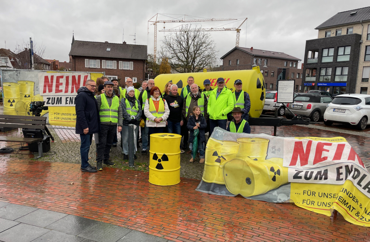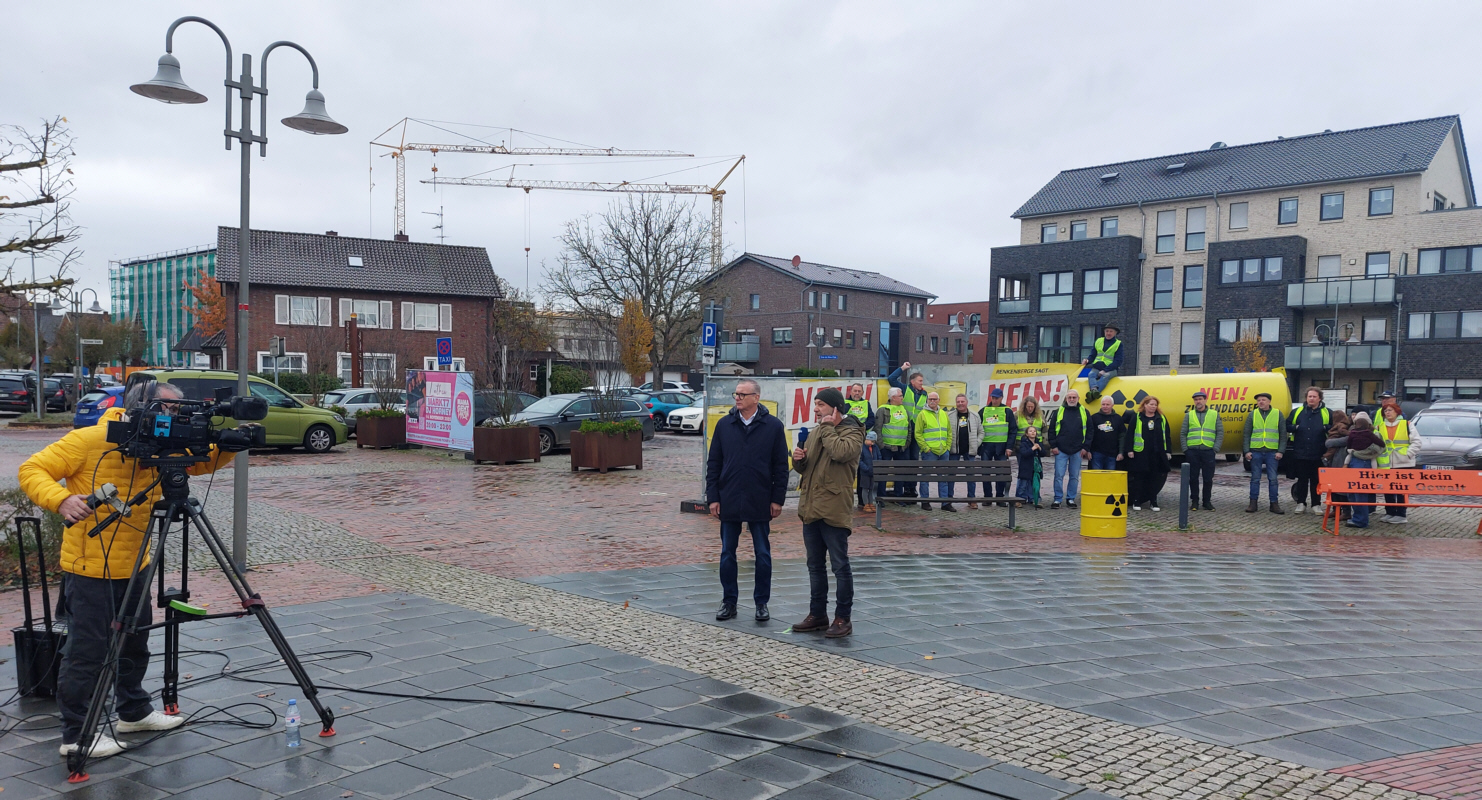 Ca. 20 Mitglieder der Interessengemeinschaft kein Atommüll im Emsland hatten sich am Montag Nachmittag auf dem Lathener Marktplatz eingefunden, um gemeinsam die Ergebnisse des diesjährigen Zwischenberichtes der BGE zur Endlagersuche abzuwarten. Da der NDR gekommen war, um Stimmen aus dem Emsland zu hören, war es ihnen wichtig Flagge zu zeigen.